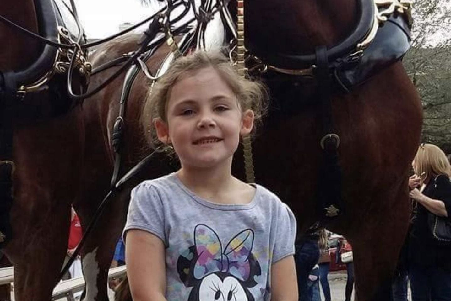fetita se bucura de o zi frumoasa intr-un cadru festiv, petrecandu-si ceva timp cu familia alaturi de caii Clydesdale ce galopau parca pregatiti de parada.