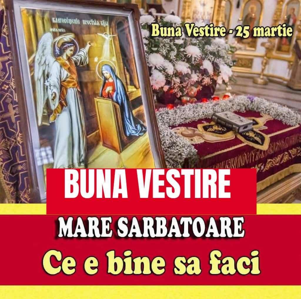 Buna Vestire este praznuita de Biserica Ortodoxa pe 25 martie. Buna Vestire sau popular Blagovestenia (termenul slav corespunzator celui de Bunavestire), este praznicul in amintirea zilei in care Sf. Arhanghel Gavriil a vestit pe Sf. Fecioara ca ea va naste pe Mesia (Luca I, 26-38).