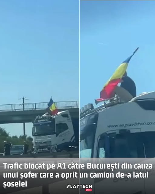 Traficul pe sensul de mers către București al autostrăzii A1 București – Pitești a fost complet blocat duminică după-amiază, după ce un șofer de camion a oprit vehiculul de mare tonaj transversal pe șosea și s-a urcat pe cabină, unde a început să fluture steagul României.