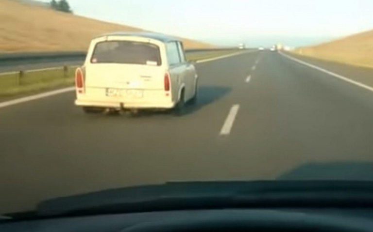 Aici intervine surpriza de proporții, pentru că pe lângă Civic a trecut în trombă un… Trabant. Unul cu siguranță modificat radical, cu motor schimbat și tren de rulare îmbunătățit, dar chiar și așa, este de-a dreptul supranatural să vezi o caroserie de Trabant zburând pe autostradă cu 200 km/h.