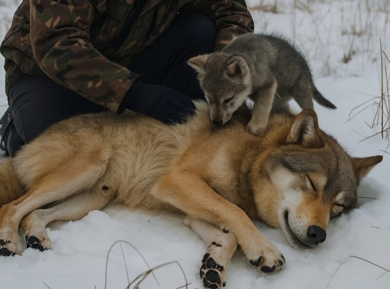 Era pe punctul de a face un pas înapoi, de a se întoarce și de a fugi, dar dintr-o dată a observat că lupul nu se mișca. Doar un pui de lup alerga prin apropiere, țipând jalnic – frecându-și botul de mama sa, încercând să o lingă.