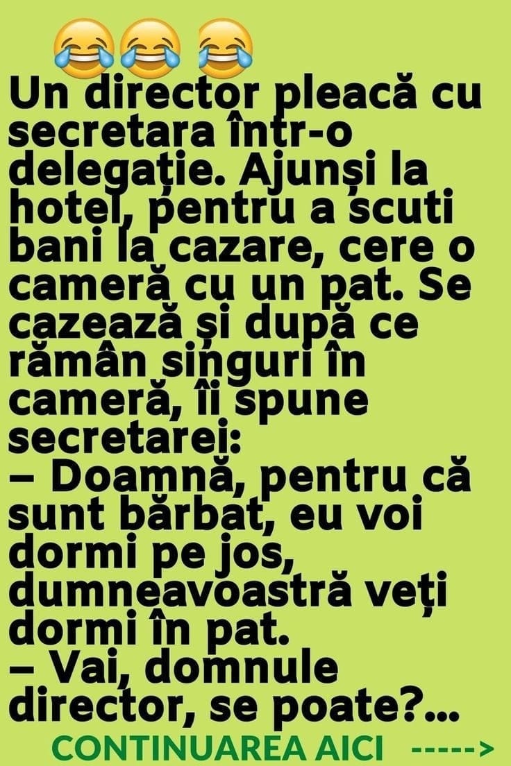 – Vai, domnule director, se poate? Suntem oameni maturi, cum se poate să dormiţi pe jos, vom dormi în acelaşi pat! – Bine, dar nu vă deranjează? zise directorul.
