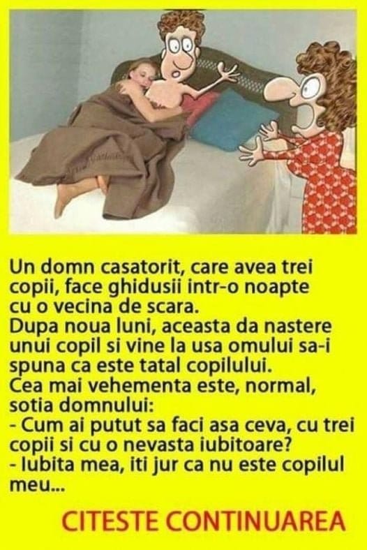 – Iubita mea, iti jur ca nu este copilul meu! Sunt gata sa fac orice ca sa-ti demonstrez, chiar si testul de paternitate!
