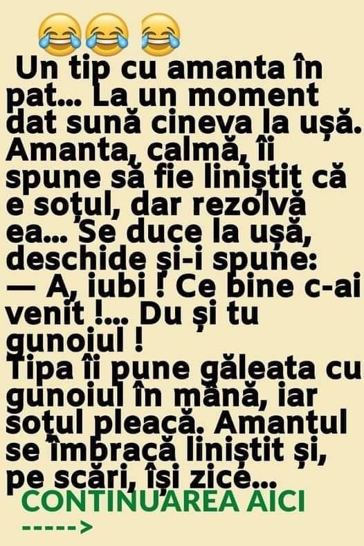 La un moment dat sună cineva la ușă. Amanta, calmă, îi spune să fie liniștit că e soțul, dar rezolvă ea… Se duce la ușă, deschide și-i spune:
