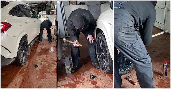 Edilul a publicat pe Facebook mai multe filmulețe în care arată cum mecanicul încearcă să-i schimbe roțile la mașină lovind jantele cu un ciocan. Unealta era probabil din plastic.